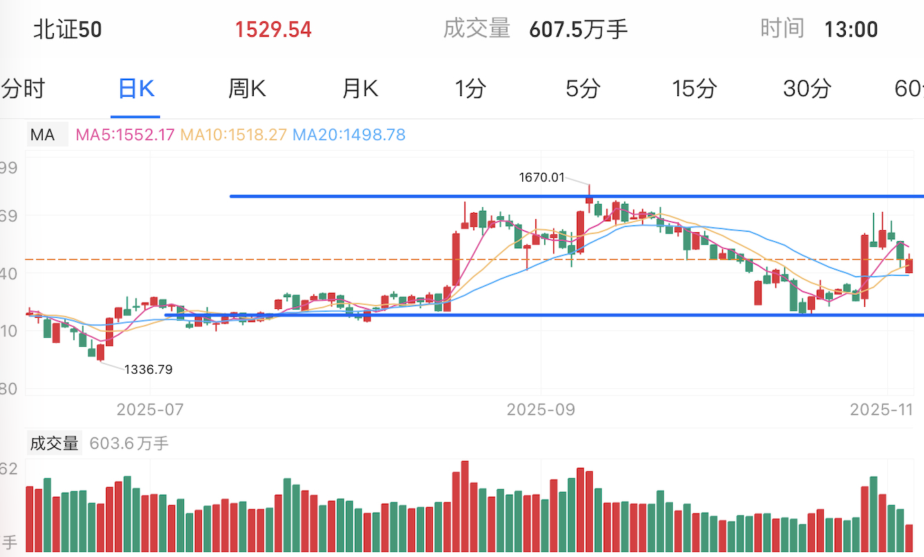北证50 此前低迷,最近守住前低支撑位并放量大涨,然而很快回落,短期趋势再次下行,距离支撑位仍有下行空间。
