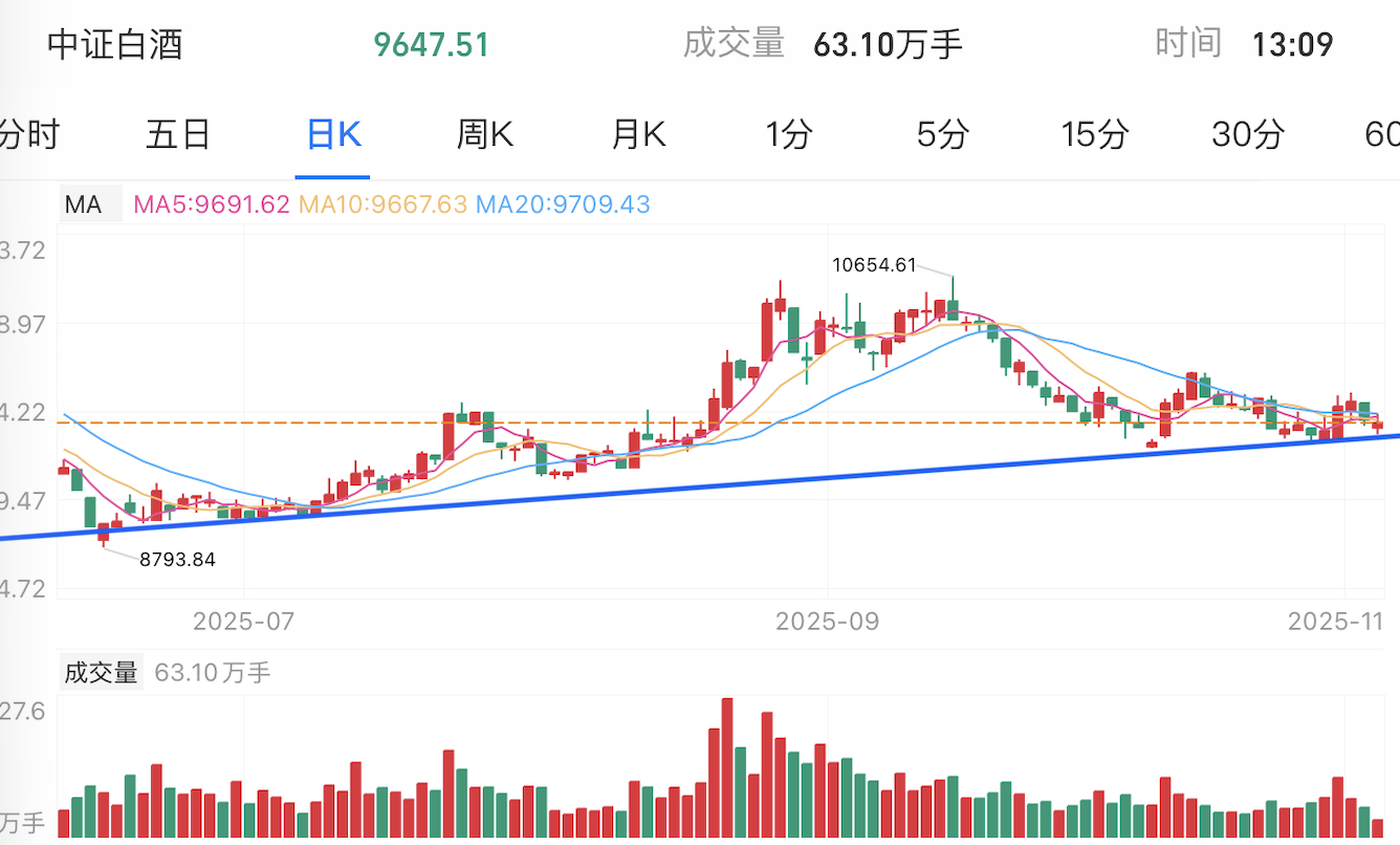 白酒此前短暂反弹,但没能持续涨势,再次回落至底部上涨趋势线震荡。前两日再次反弹,突破压力位,但很快回落,继续横盘震荡中。