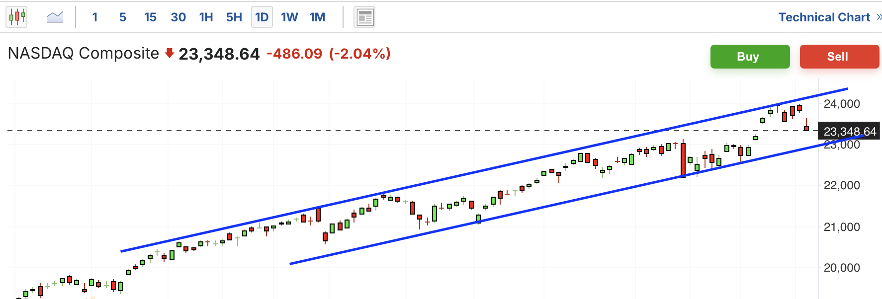 这种调整形态通常意味着市场结构性破坏,情绪极度悲观,修复周期较长,甚至可能演变为熊市。即使随后出现技术性反弹或“跟进日”,其持续性也常常有限。例如 2018 年 10 月的纳斯达克指数,从50日线一路跌破至200日线,几度反弹皆告失败。