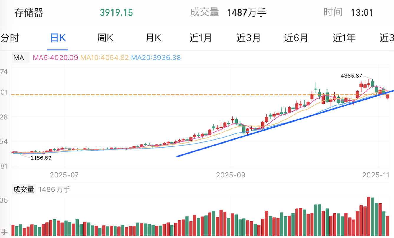 存储芯片近期震荡上行,最近在大幅上涨后回落,前两天在上涨趋势线止跌反弹,但很快再次回落,今日还跌破上升趋势线,跌至前低支撑位,如果再次跌破则就此下行。