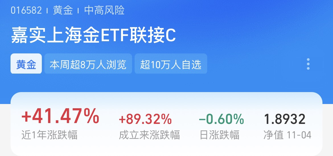 美联储年内预计还有一次降息,现在黄金走弱我觉得回调就是机会。弱美元下,黄金预期还会继续上涨,$嘉实上海金ETF发起联接C$ 讨论区还有包包可以领取,它整体的防守能力挺优秀的,在十月的回撤中跌幅比同类小,攻守兼备。而且近期股市震荡较多,黄金长期持有风险波动较低,就连央行都连续11个月增持,创下记录,黄金仍具有配置价值,该基金买入卖出七天没有手续费,申赎灵活,操作起来也更方便,继续期待黄金的拉升
