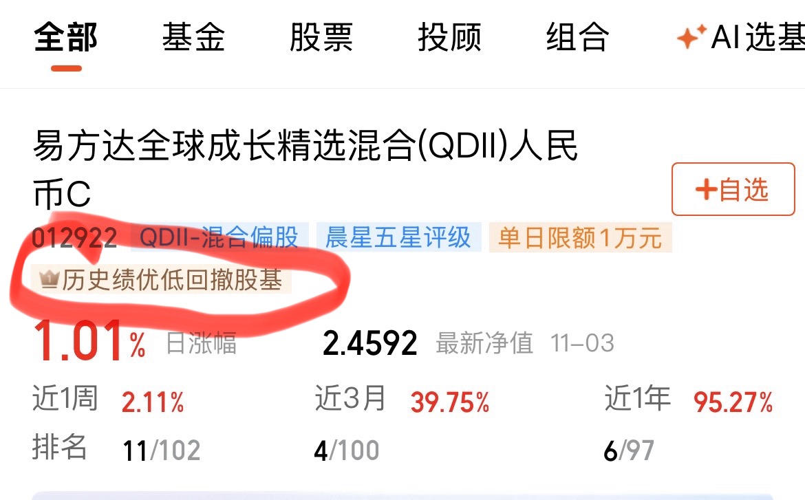 发现没有,$易方达全球成长精选混合(QDII)人民币C$ 在“历史绩优低回撤榜单”中保持第一,这只基金是投全球科技(A、H、美股都能投),市场上也是比较稀缺的,可以灵活规避政zhi风险,同时把握住多个市场的科技成长机遇;