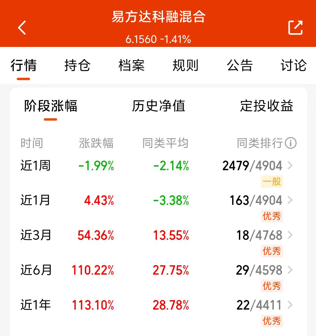 大盘今天表现还不错,三大指数持续拉升,科技、新能源等板块都涨了不少呢,近期市场波动比较大,各大板块轮动很快,我准备分散投资,易方达科融混合持仓有新能源、科技和军工等板块,轮动配置,经理全市场配置能力不错,近六个月涨了110.22%,我准备入手了!