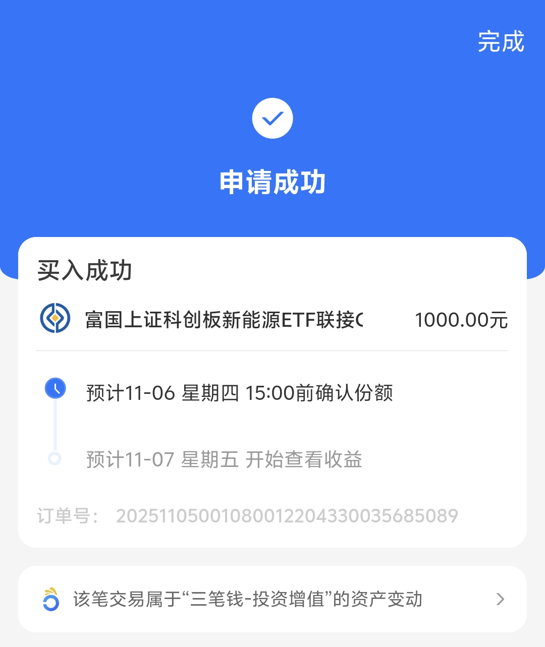 今天我自己加了1000元到$富国上证科创板新能源ETF发起式联接C$ 上。平时关注新能源这个方向,觉得这个产品挺方便,直接涵盖了科创板里一批相关公司,不用费心去挑个股。新能源领域的长期发展我是看好的,技术进步和政策支持都比较明确,虽然短期市场总有波动,但着眼长远的话,现在的配置或许是个不错的积累机会。我个人觉得这个方向未来还有不小的成长空间,会继续留着观察和持有。