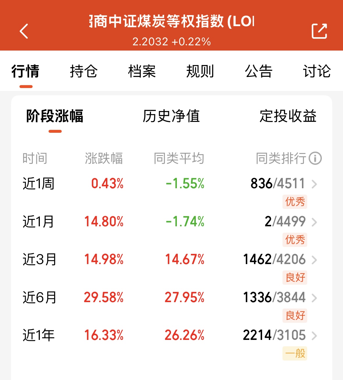 到现在指数全都翻红了,板块轮动的速度很快,没有持续性的上涨。资源类煤炭最近的表现要好些,我自选的$招商中证煤炭等权指数(LOF)C(OTCFUND|013596)$今天估值大涨3%,近一月14.8%,从10月开始表现就很强,进入四季度后,随着能源结构优化,煤炭作为主体能源的地位稳固,叠加供给侧改革与行业集中度提升,煤炭行情有希望持续。