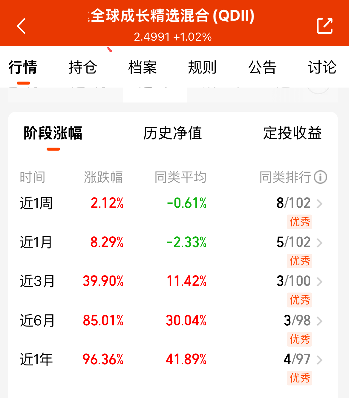 持有美股的昨天晚上跌麻了!这个时候均衡持仓的好处就来了,因为A股抗住了这波下跌,指数还收红了,非常给力。$易方达全球成长精选混合(QDII)人民币A(OTCFUND|012920)$持仓可以投A股、美股、港股,加上经理的实力调仓,业绩是相当给力的,近一周2.12%,近六月85.01%,我已经持有啦,后面继续看好!