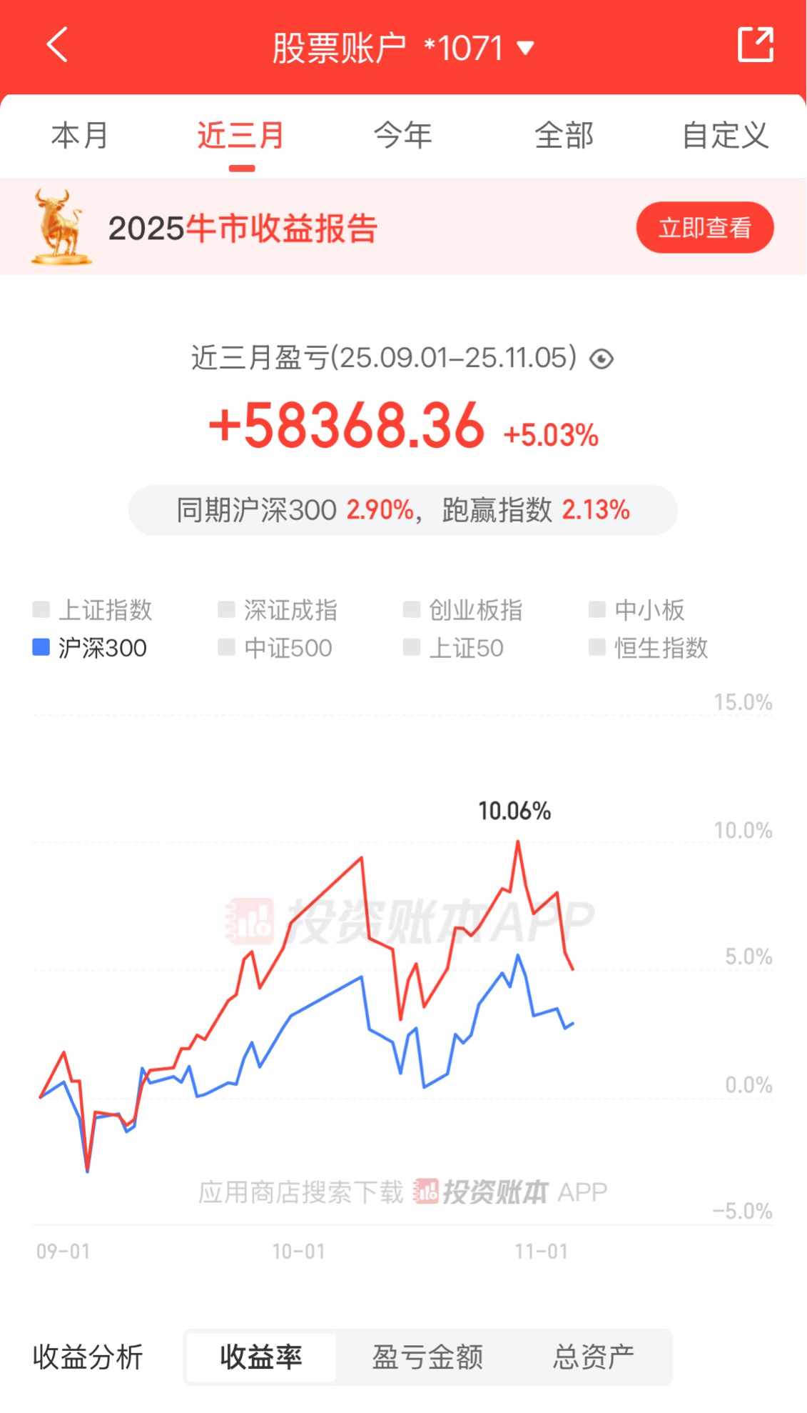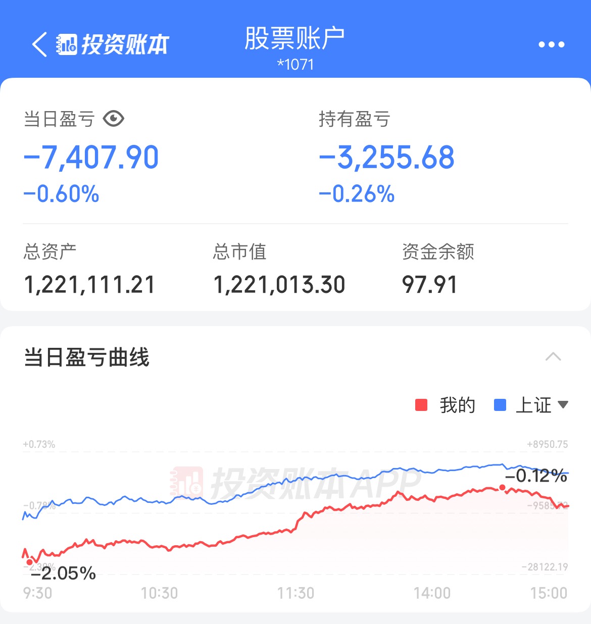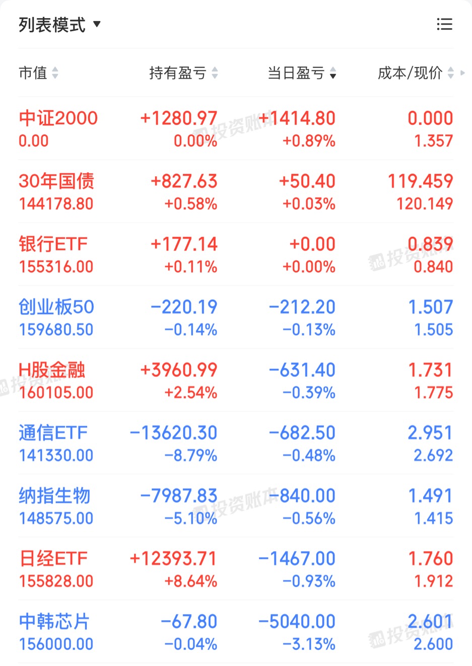 今日账户亏损:7408元。 11月5日,A股三大指数今日集体上涨,截至收盘,上证指数涨0.23%,深证成指涨0.37%,创业板指涨1.03%,北证50跌0.21%。沪深京三市全天成交额18943亿元,较上日缩量441亿元。全市场超3300只个股上涨。 ETF收盘涨跌不一,光伏ETF龙头(560980)领涨5.59%,电网设备ETF(159326)涨5.31%,科创新能源ETF(588830)涨5.18%。亚太精选ETF(159687)领跌3.56%,中韩半导体ETF(513310)跌3.13%,红利低波ETF新华(560890)跌2.94%。