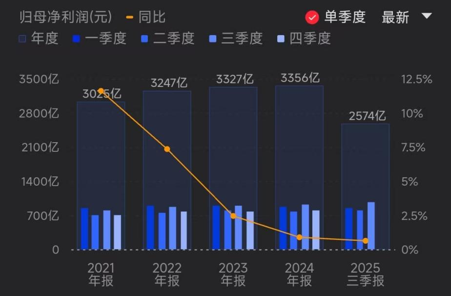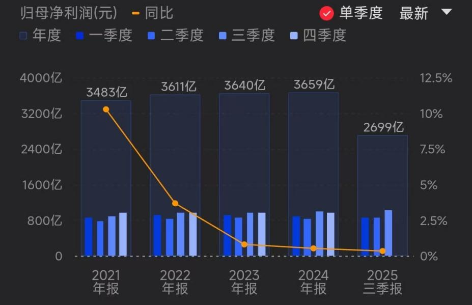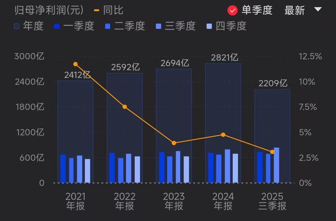 2、利润:第三季度归母净利润为952.84亿元,同比增长4.19%;前三季度归母净利润为2573.6亿元,同比增长0.62%。