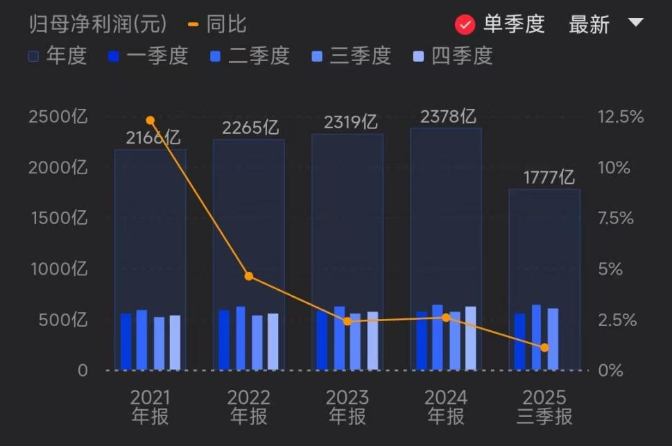 2、利润:第三季度归母净利润为600.69亿元,同比增长5.09%;前三季度归母净利润为1776.60亿元,同比增长1.08%