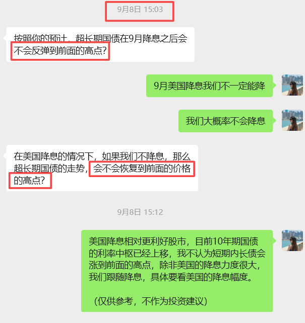 我还遇到过一个特别典型的案例,有个宝子在9月初的时候问我美联储降息之后超长期国债会不会反弹到前面的高点,我一次回答得比较委婉,说的是我们大概率不会跟随降息,然后他紧接着又问了一遍,我能感觉到,他心里是强烈认为会反弹的,就是来找我求个认同而已。所以第二次,我就明确回复了:“大概率不会。”当然,他最后有没有听进去,我就不太清楚了,但很明显,他是带着自己预设的观点来问的我。