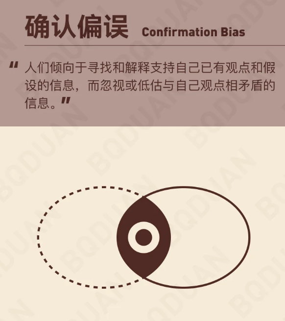 就好比你爱上了自己持有的股票,从此,你只愿意看它的优点,听它的好消息,对它的缺点和坏消息视而不见、充耳不闻。这种潜意识的、自我欺骗的行为,就是行为金融学里一个非常典型的认知偏差,叫做——“确认偏误”。
