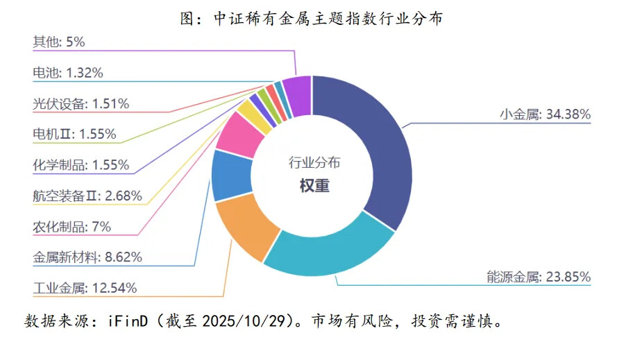 按照申万二级行业分类,除其他类别以外,指数前三大细分行业分别为小金属(34.38%)、能源金属(23.85%)、工业金属(12.54%)。