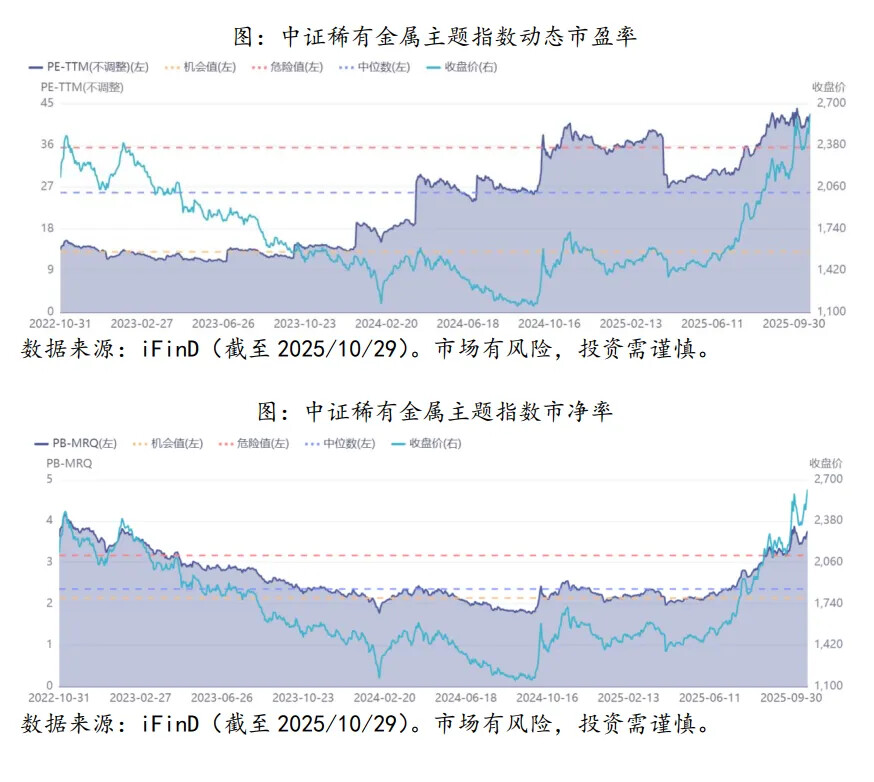 截至2025年10月29日,中证稀有金属主题指数动态市盈率为42.74倍,位于指数上市以来56.19%历史分位数;市净率为3.76倍,位于上市以来51.55%历史分位数。