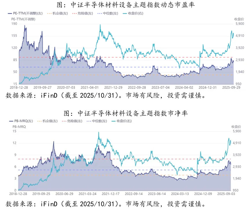 截至2025年10月31日,中证半导体材料设备主题指数动态市盈率为79.12倍,位于指数上市以来 66.53%历史分位数;市净率为 6.55 倍,位于上市以来65.33%历史分位数。