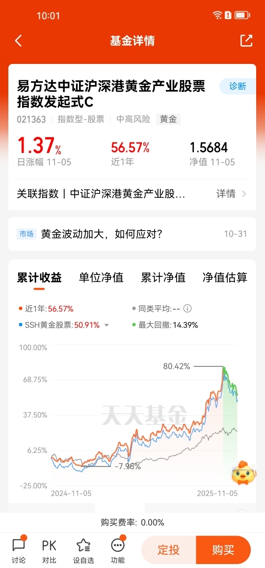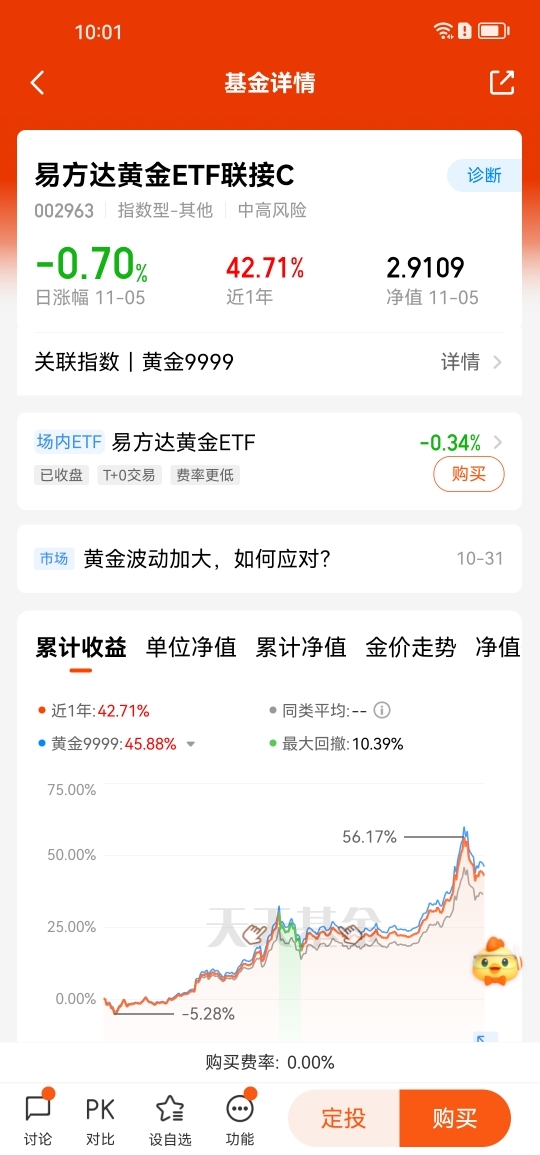 用易方达黄金ETF联接C,就像养了只电子宠物黄金兽——每天看看净值,偶尔喂点定投,剩下的交给时间。毕竟,黄金的浪漫在于:它不会让你一夜暴富,但能让你在风雨飘摇时,心里总有个压舱石。@易方达基金