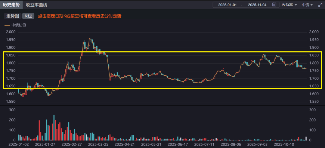 从年初开始,咱们即提到,不看空债券,认为低利率环境将继续,回头看过去的10个月,虽然债市有起有伏,但10年国债维持在1.6%-1.95%的区间,而去掉波峰谷底后,大部分的时间中枢,基本就在1.65%-1.85%之间,下图,是10年国债240023的年初以来走势图。