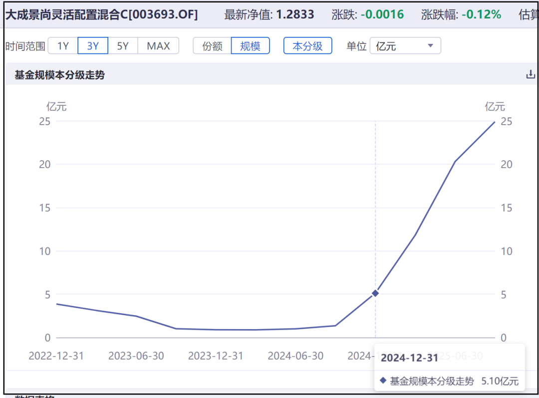 聊下今年一来,业绩并不算拔尖的大成景尚A(003692),虽然今年业绩不拔尖,但胜在最近三年业绩很稳定,且波动率很低,而从规模看,今年以来,规模上的不算小,C份额从去年底的5亿,到了三季度末的25亿。