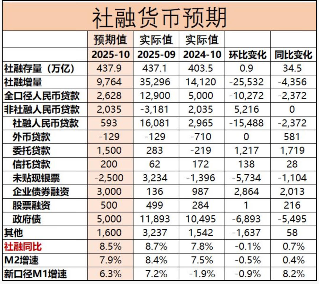 往后看,下图,是10月信贷社融M1预期一览,来自招商固收团队,估计增速继续下行,债市维持窄幅震荡的判断不变。