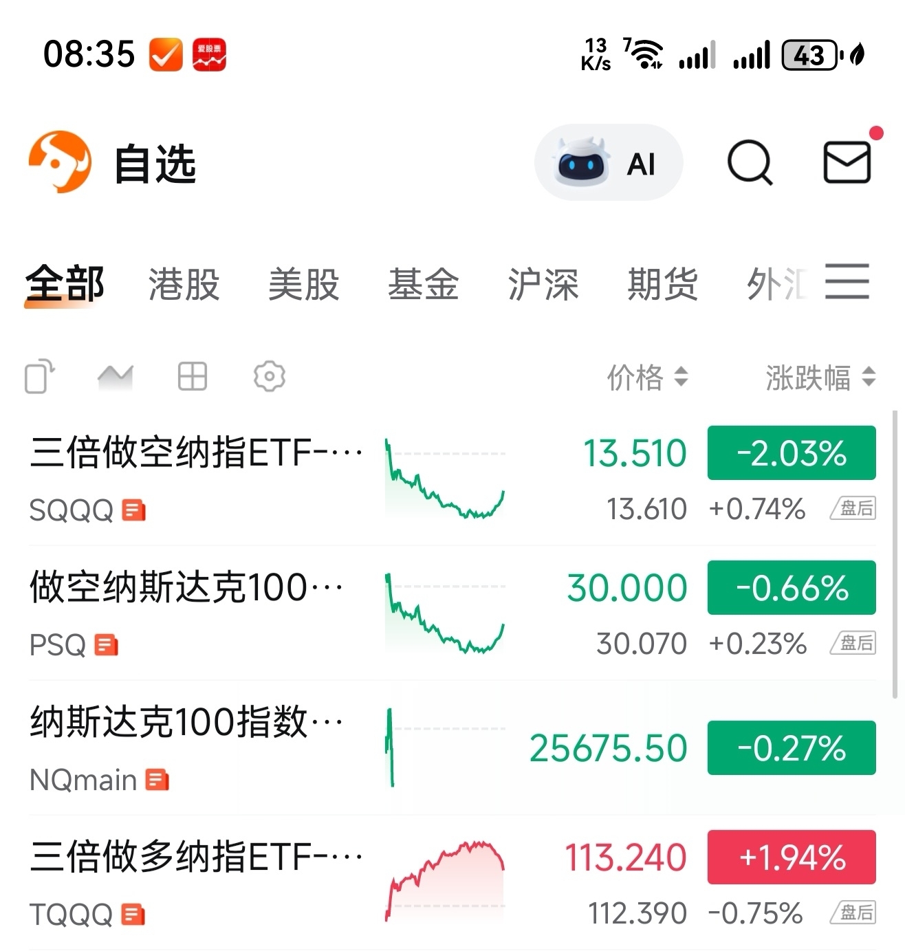 在今天上午8点半之后,目前观察三倍做多纳指ETF在夜盘表现是涨+0.74%。观察做空纳斯达克100指数ETF,在夜盘表现是小涨+0.24%。(根据这些数据来看,观察有有小部分人选择白天的时候,又开始选择做空美股纳斯达克指数了。)