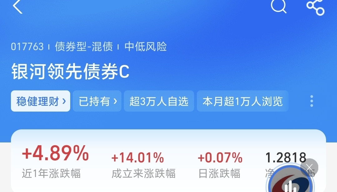 昨天市场早盘走势疲软,不过尾盘迎来强势反弹,混债也顺势拉升。$银河领先债券C$ 昨日表现不错,逆势赚了7个蛋,近一年上涨4.89%,实力在线!今年我对偏债混合类一直很有信心,现在行情起来了,我也趁机加一波。