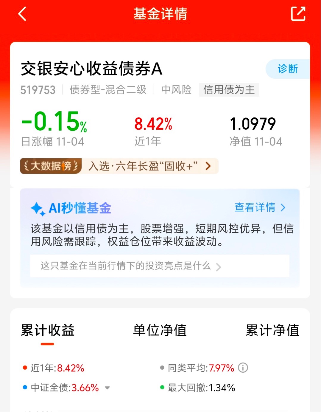 $天弘中证全指通信设备指数发起C$ 提及“固收+”,交银安心收益A的优势很有看点。它靠信用债筑牢收益的根基,借专业选股实现权益的增强,近1年收益在同类平均和中证全债之上;风控表现优异,最大回撤仅1.34%,在稳健投资中把握市场机会;还跻身“六年长盈‘固收+’”大数据榜,长期业绩彰显实力。从选股逻辑而言,这类“固收+”产品的权益选股通常聚焦低估值、高股息、业绩稳定的标的,在把控波动的同时努力为组合增加收益,交银安心收益A的这一布局,充分贴合“固收+”的稳健特性与收益弹性诉求。