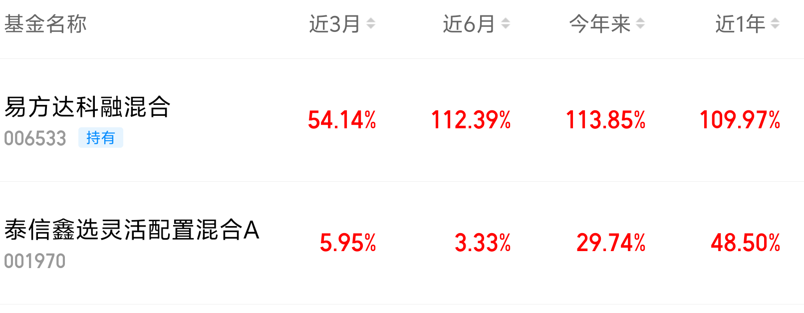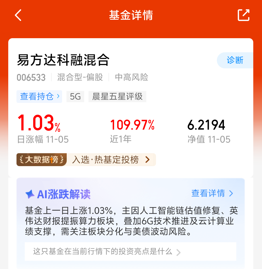 大盘今天继续上涨,科技和新能源等板块表现不错,近期市场波动比较大,各大板块轮动速度也很快,易方达科融混合持仓有科技、新能源和军工等板块,轮动配置,持仓比较均衡,近三个月涨了54.14%,近六个月涨了112.39%,经理调仓能力不错,近期单一市场容易踏空,相信经理调仓能力,我准备分批加仓!