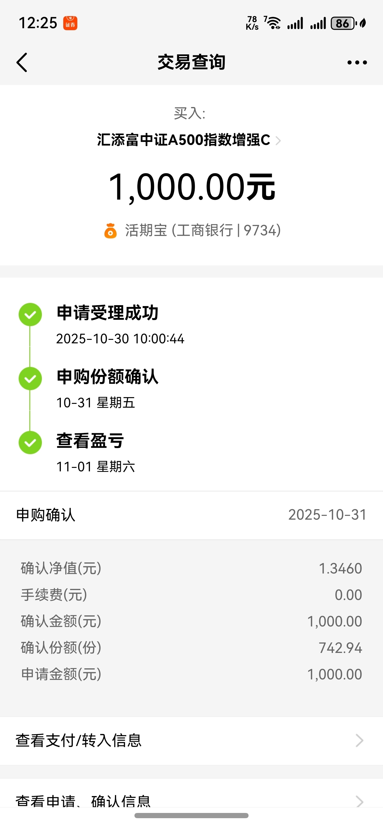 根据观察在上周四10月30日那天的时候,加仓1000元这点持有份额在今天刚好够7天了。在今天,可以选择趁着中证a500指数在继续反弹大涨的时候,选择减仓卖出这一点持有份额资金操作的。