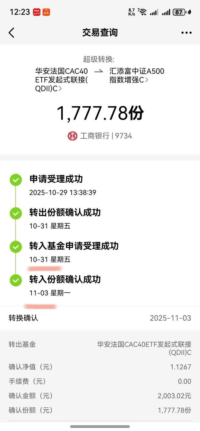 在今天中午的时候,仔细观察一下在上周三10月29日那天的时候,选择清仓与调仓换买某股某个中证a500指数基金的这部分资金。是在上周五10月31日那天的时候,才被基金公司确认买入份额的。(也就说这部分持有份额资金,在今天还不足7天的。只能等在明天周五那天的时候,到时候才可以选择无手续费卖出操作了。)