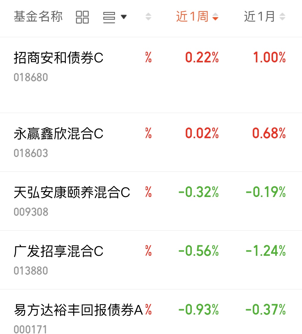 $招商安和债券C(OTCFUND|018680)$近一周收22个蛋,10%权益,相对来说稳一些。$广发招享混合C(OTCFUND|013880)$近一周丢56个蛋,$易方达裕丰回报债券A(OTCFUND|000171)$近一周丢93个蛋。盈亏同源,涨的多的也跌的多,跟持股的行情息息相关。