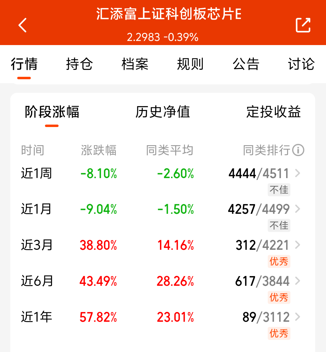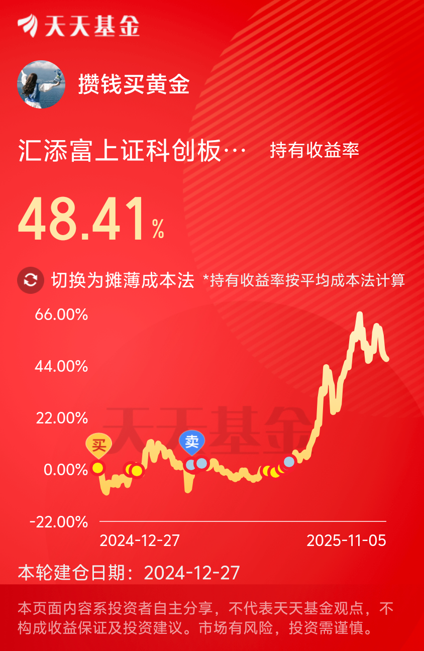 在国家持续加大政策支持、推动产业链安全与升级的背景下,国产芯片行业拥有广阔的成长空间和明确的长期逻辑,半导体芯片是数字经济的基石!汇添富上证科创芯片C近三个月涨了38.80%,近一年涨了57.82%,目前持有收益率已经48.41%了,持仓7天免赎回,操作比较灵活,长期看好这个方向,我准备继续分批加仓了!