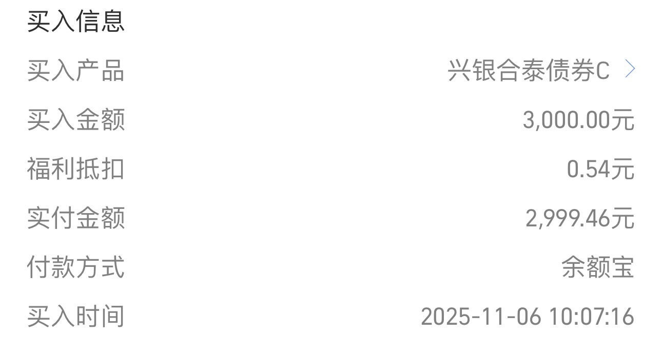 $兴银合泰债券C$ :小王今日红包3000-0.75上车,目前已经连涨17个工作日,最近的表现真的是很可以,所以我今日决定趁着信用债行情上涨的趋势还未改变我,今日要决定继续上车一笔;从最新的第三季度持仓来看:信用债占比109.16%,利率债占比11.66%,既有稳定的信用债打底,再配备的部分的利率债去进攻收益,总体给我的感觉也是涨得多碎得少的基金类型,再加基金经理的优秀操作,所以目前近一年的收益率都已经达到3.60%,这样优秀收益率我也能接受适当的波动,所以我今日综合考虑准备上车3000