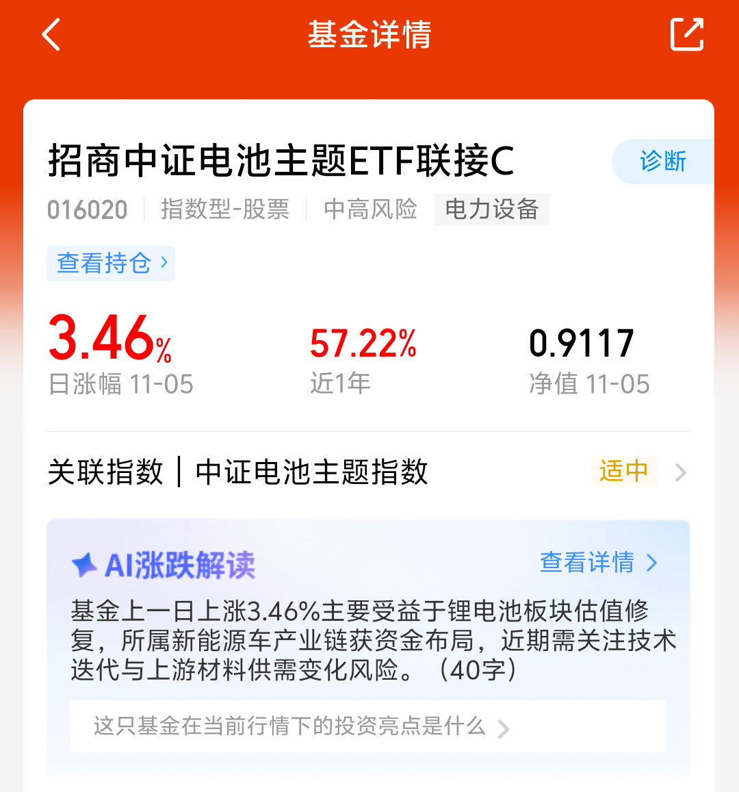 电池板块近期表现还不错,$招商中证电池主题ETF联接C(OTCFUND|016020)$昨天大涨3.46%,今天又涨了两个点,近一年收益率57.22%!固态电池核心标的涨幅比较多的已经回调了20%-30%了,风险充分释放,国庆节后,人民日报、新华社等持续关注报道行业进展,长期看好这个方向,我准备继续分批加仓!