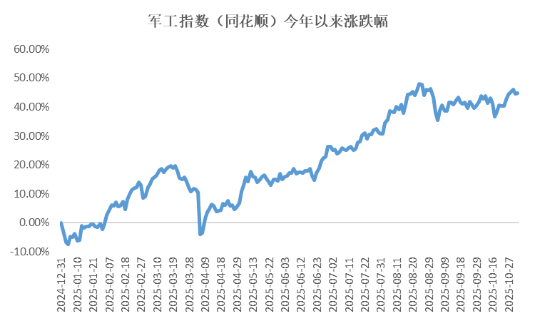 当“十四五”收官与“十五五”规划衔接形成共振,军工板块近期迎来了较高景气度。截至2025年10月31日,今年以来同花顺军工指数涨幅高达44.8%,中证全指航空航天与国防指数上涨14.5%。整体来看,从政策、时点与估值等多个维度观察,军工板块的投资机会或许值得关注。(数据来源:iFinD,截至2025.10.31。指数过往表现不代表未来,也不代表基金的未来表现。基金有风险,投资需谨慎。)