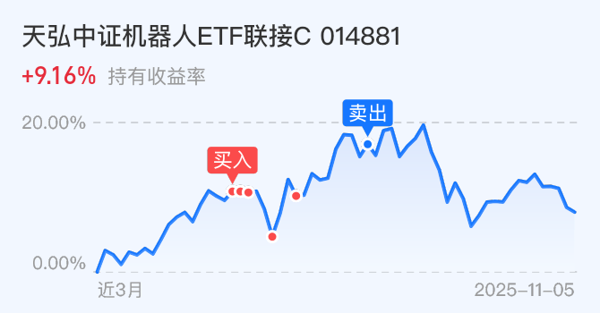 机器人板块昨日触底有所拉升,超跌也有修复趋势,今日量能跟上,板块高开盘中震荡高走,截至发稿涨势良好。板块虽有所修复,但是当前量能不足以直接上攻突破重要均线阻力,也就是说暂时还没有扭转趋势,在此位置可能还有波动。今日不动。$天弘中证机器人ETF发起联接C(OTCFUND|014881)$