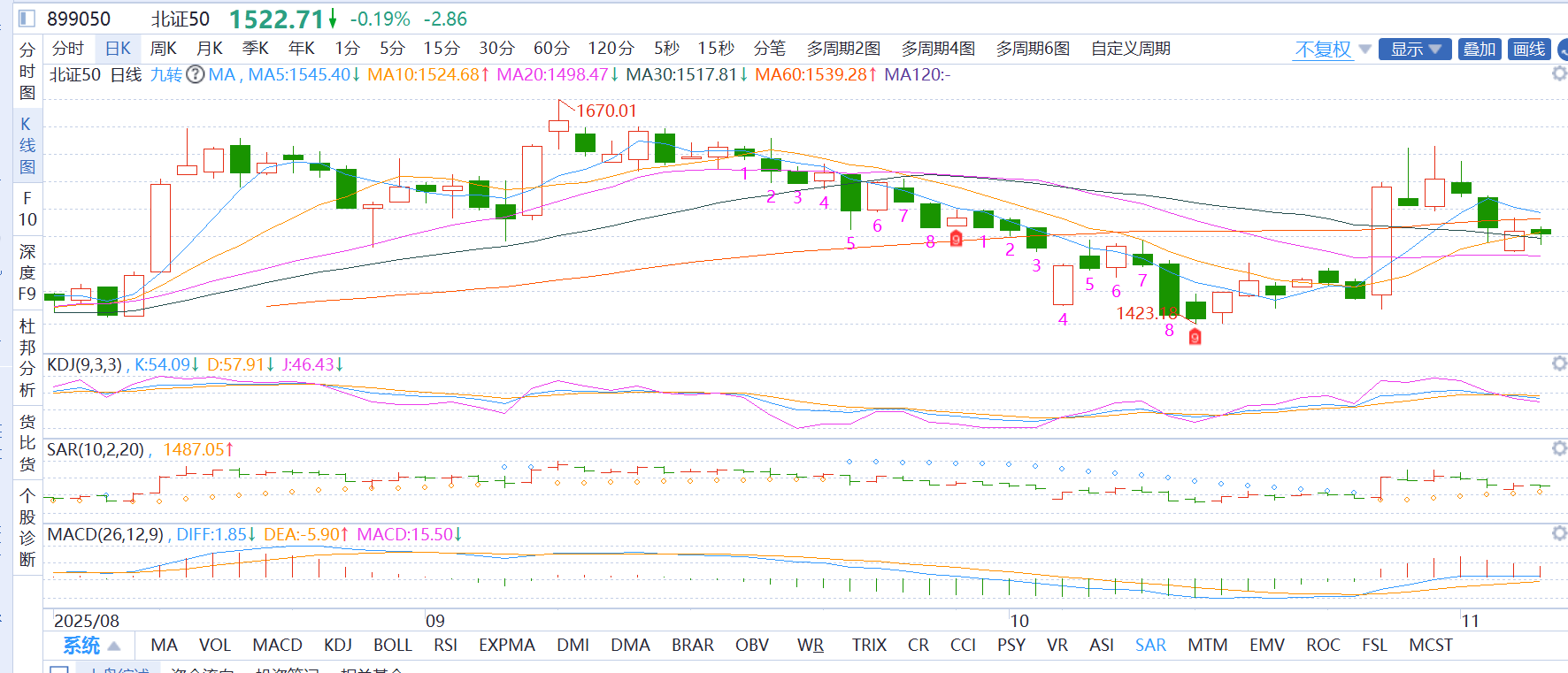 北证50:技术面表现平淡,今日微跌,虽未能跟上主板上涨节奏,但板块波动较小。在1520点附近有支撑,麦爸选择躺平,等待成交量放大。