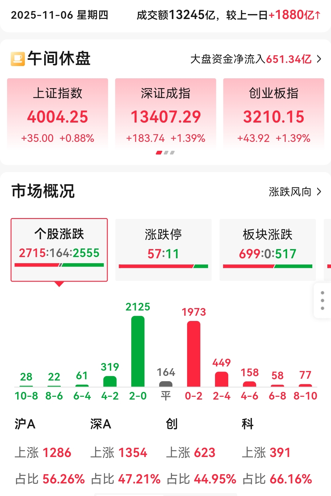 今天盘面太给劲了!沪指重返4000点,科创50涨超3%,三大指数集体飘红,两市半日成交额也显著放大至13245亿元,市场情绪明显升温。