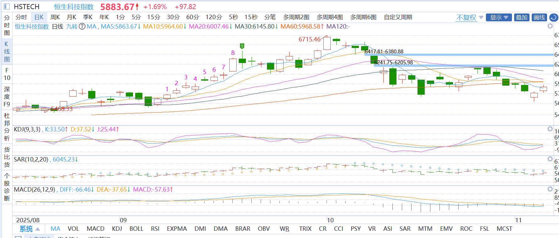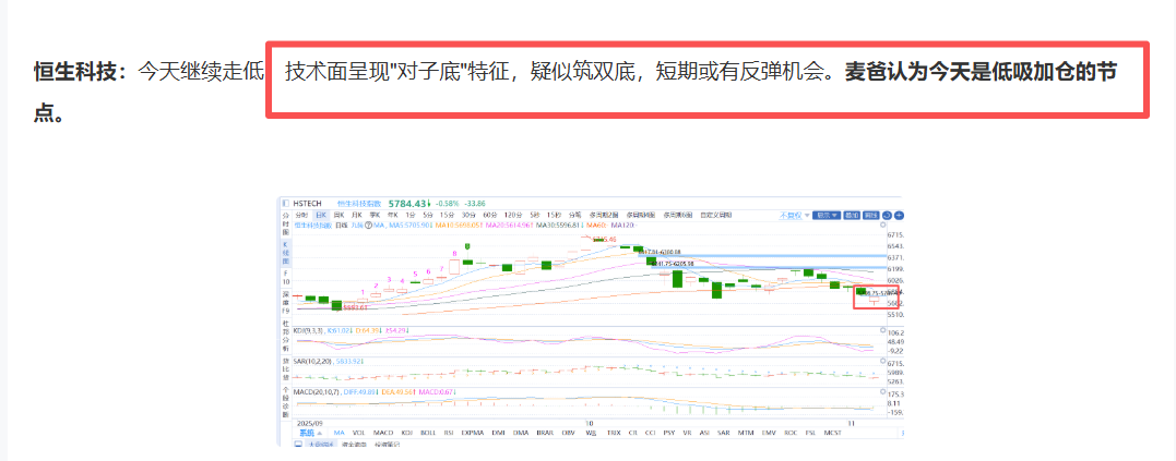 恒生科技:昨日提示对子底是低吸点位,今日就跟着恒生指数一度涨逾2.%,技术面已经形成上涨趋势。阶段继续看涨,麦爸选择继续持有,对了,麦爸认为今日也是右侧买点。