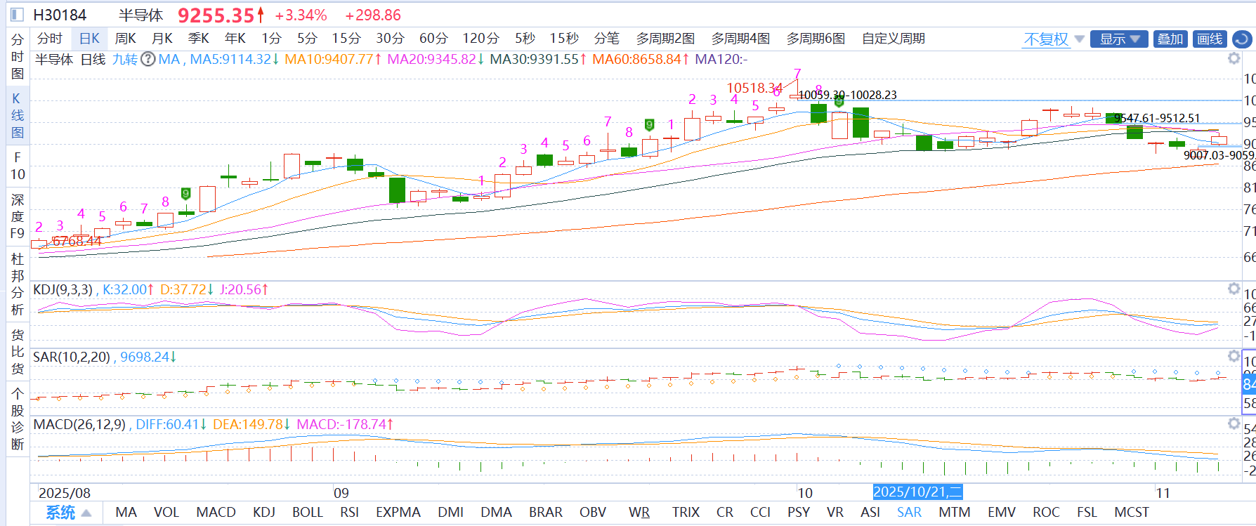 半导体: 技术面探底回升,科创50带动板块回暖,短期止跌信号初现。麦爸继续持有躺平。