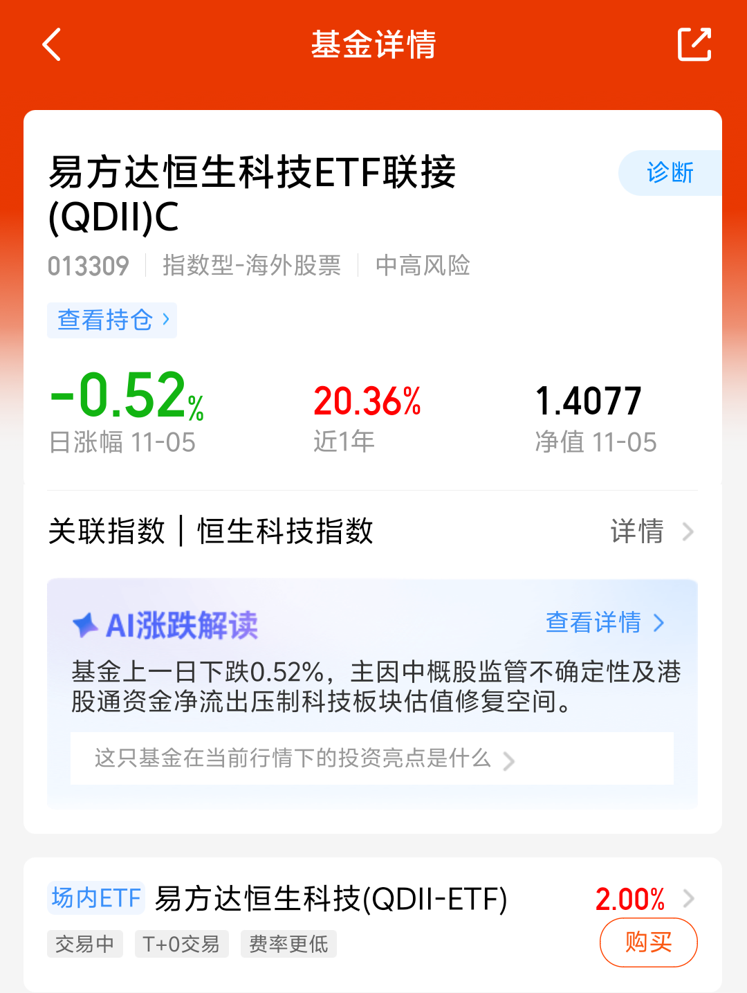 大盘今天涨了不少,恒生科技今天也涨起来了!近期调整的差不多了,恒科目前一应跌回9月初的水平了,目前评估整体影响因素可控,再加上南向资金持续流入,恒科估值处于低位,$易方达恒生科技ETF联接(QDII)C(OTCFUND|013309)$近一年收益率20.36%,我准备分批加仓了!