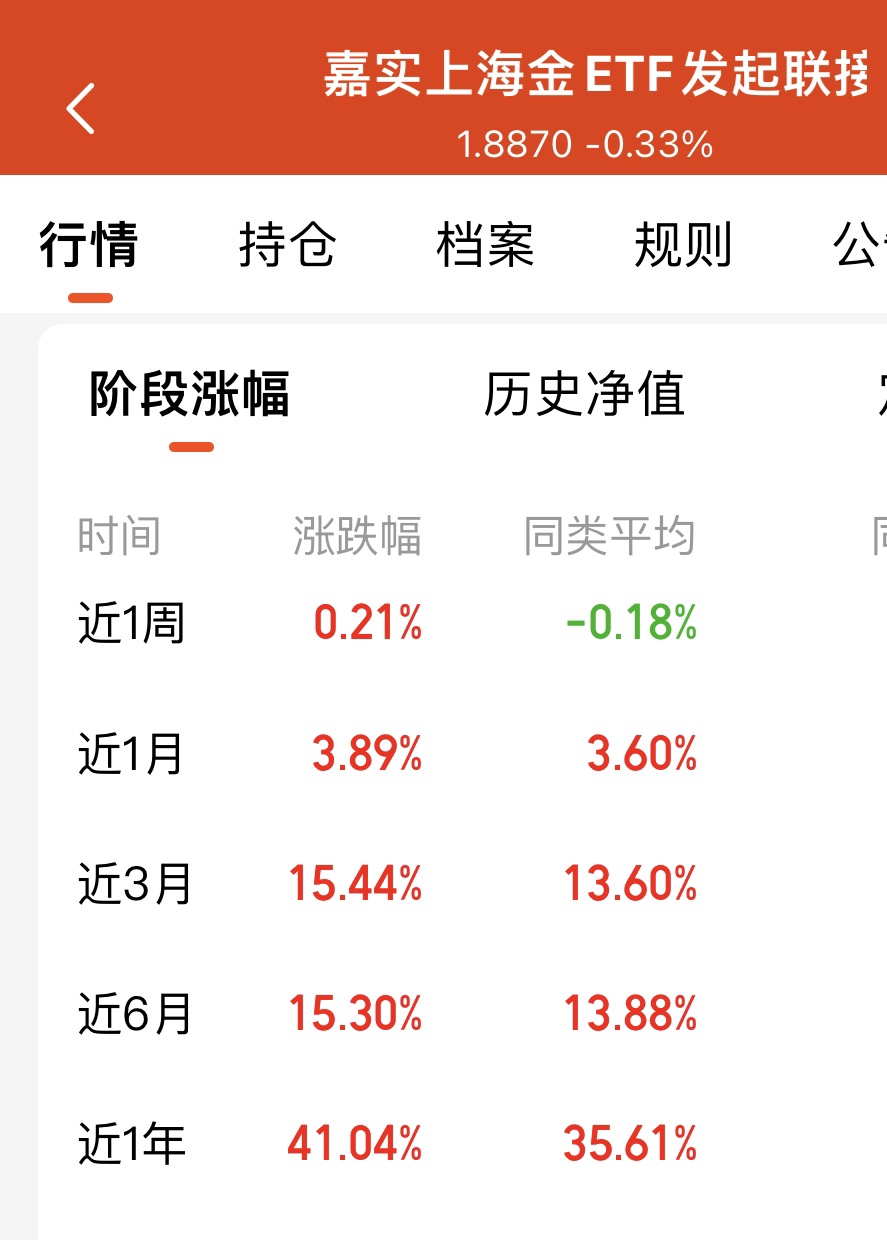今日继续加仓$嘉实上海金ETF发起联接C$ 1000元,十月黄金在连续创下历史新高了,连续回调,但是这次回撤中,嘉实黄金表现挺亮眼,防守能力较强。跌幅比同类较低,连跌三天后,企稳修复。黄金的价值长期来看避险效应增加,配置价值凸显。它密切跟踪上海金,买入卖出七天没有手续费,操作更方便,资金调度也刚灵活。叠加美联储降息周期,黄金我感觉还会继续上涨,当前位置不高,我继续埋伏低价。