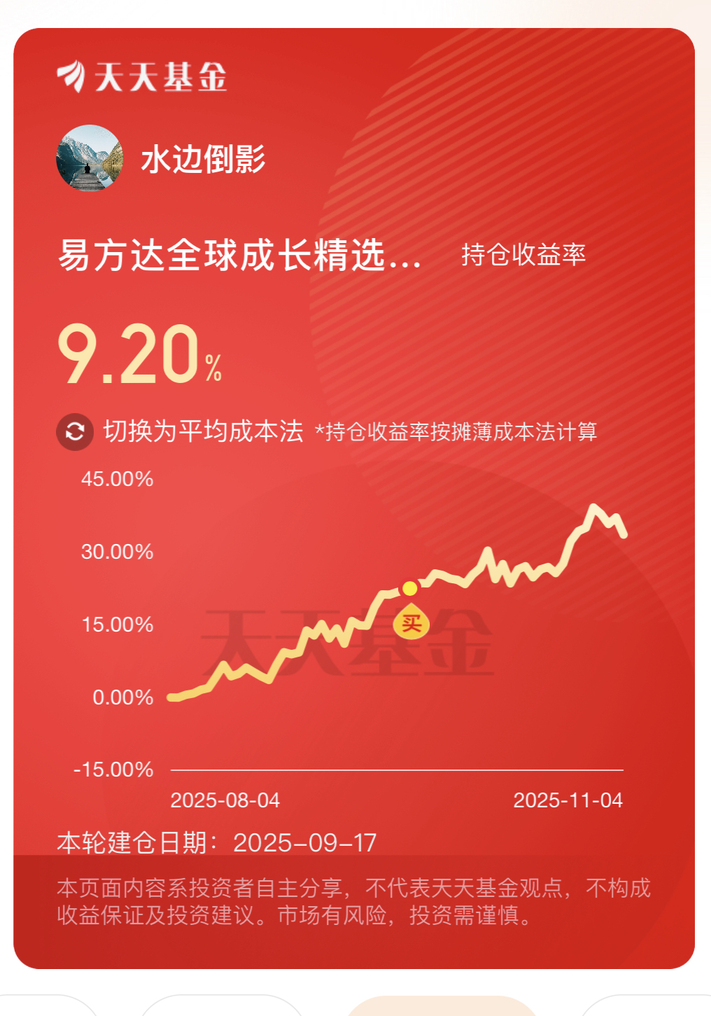 昨晚美股涨起来后,今天A股、美股一起反弹,科技赛道直接吃肉行情。我趁机加仓了易方达全球成长精选C,它一键打包了全球科技龙头,不用纠结单板块轮动,不管是美股算力股还是亚太创新企业都能蹭到涨势。之前持有已经9.20%,收益稳着往上走,我也继续补点仓位,既能跟紧这波反弹,长期也能吃科技长牛的红利,挺安心的。