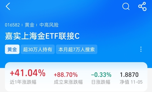 黄金经过近期回调后,价格来到了相对低位,此时的配置性价比愈发突出。我持有的$嘉实上海金ETF联接C$ ,近期业绩表现颇为亮眼,近一年收益率更是高达41.04%,这样的收益表现完全符合我的预期。
