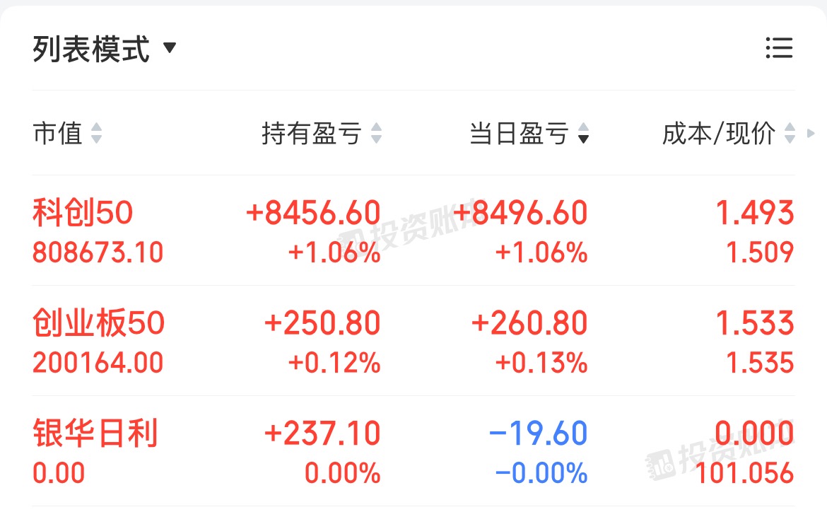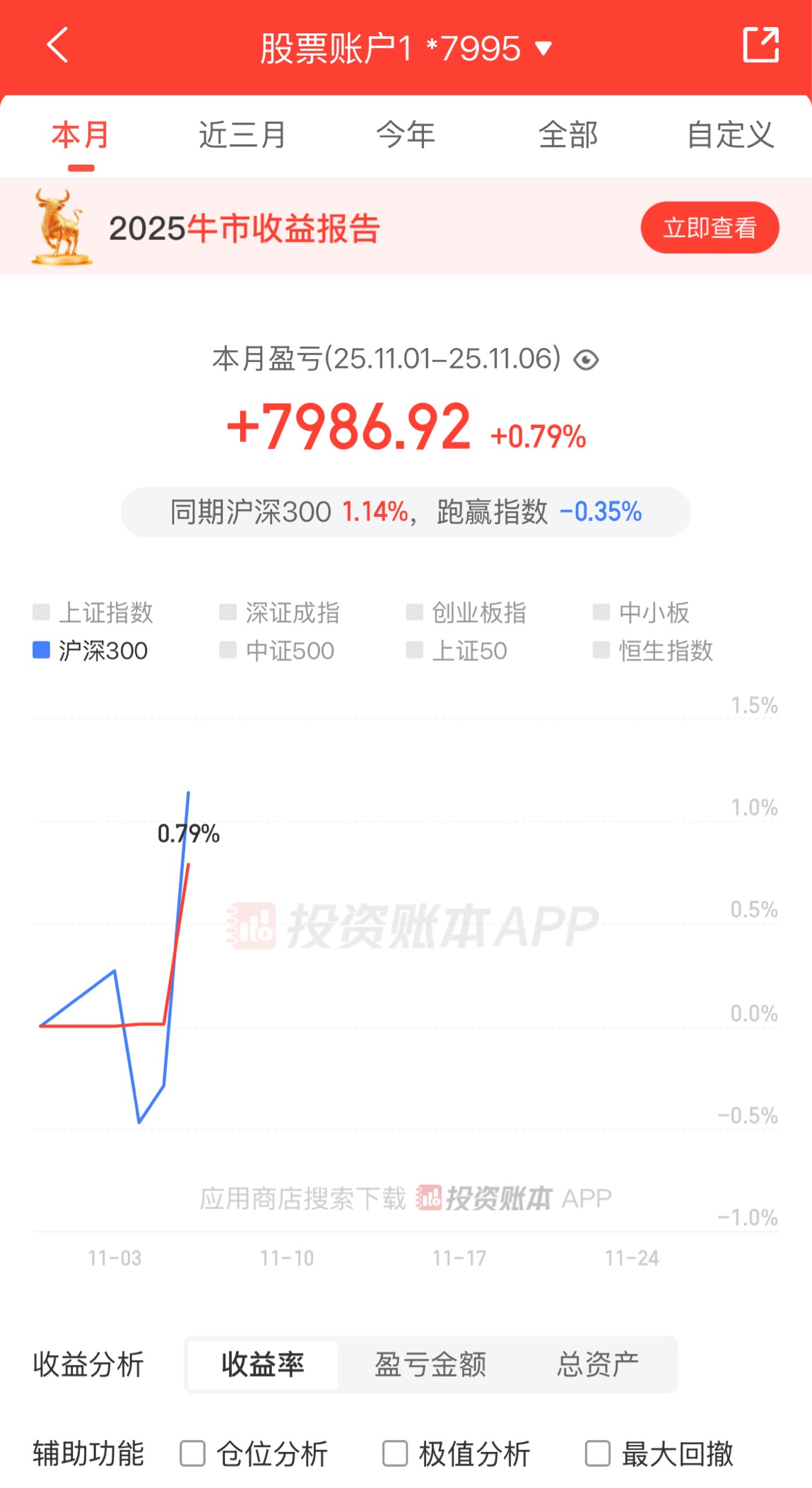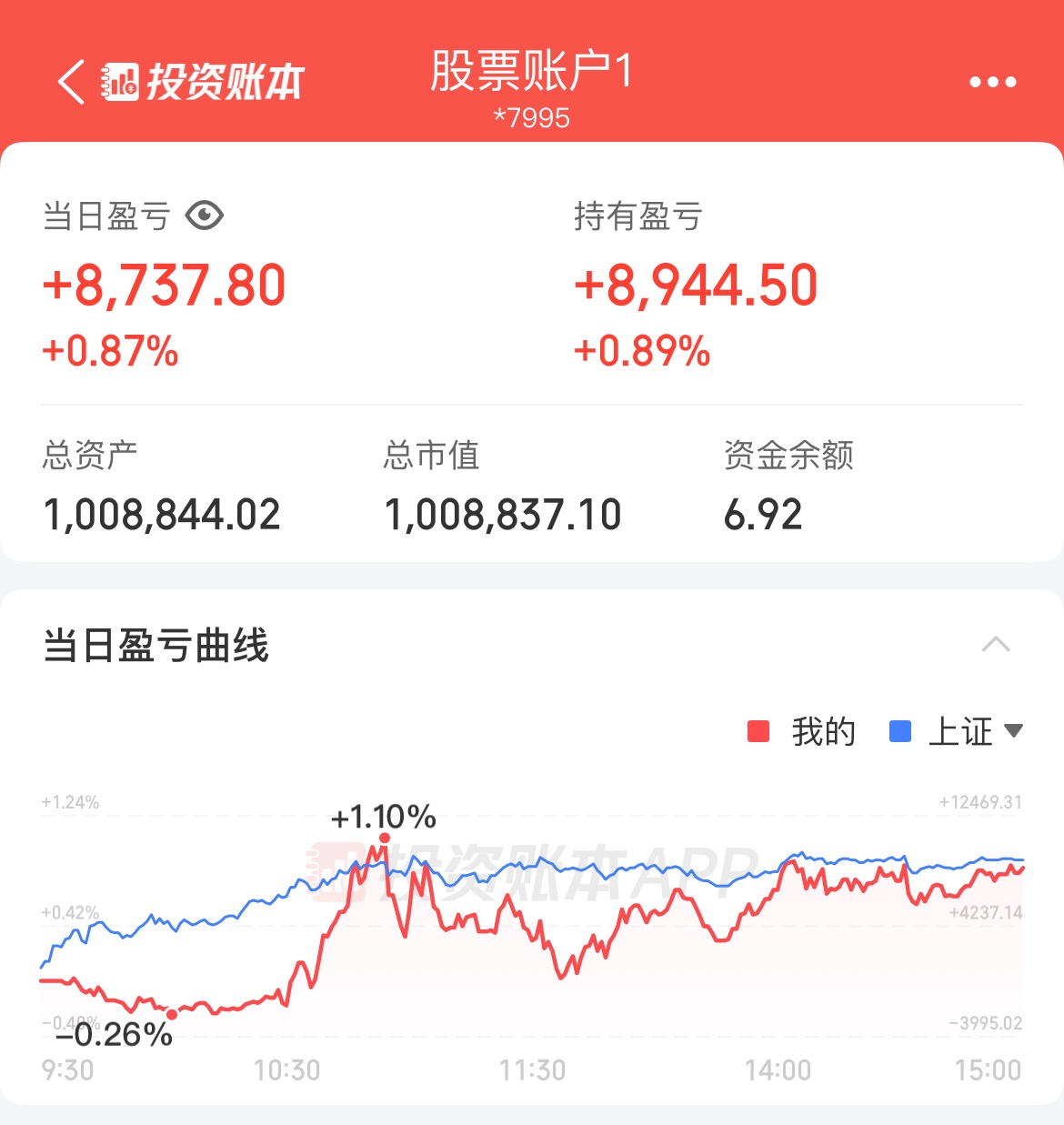 今日账户盈利:8738 元。 11月6日,A股三大指数今日集体上涨,截至收盘,上证指数涨0.97%,深证成指涨1.73%,创业板指涨1.84%,北证50跌0.38%。沪深京三市全天成交额20759亿元,较上日放量1816亿元。全市场超2800只个股上涨。 ETF收盘涨跌不一,半导体设备ETF(561980)领涨4.85%,半导体产业ETF(159582)涨4.84%,科创芯片ETF国泰(589100)涨4.73%。影视ETF(159855)领跌2.25%,影视ETF(516620)跌2.19%,旅游ETF(159766)跌1.46%。