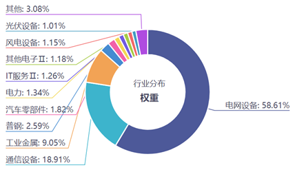 从行业分布来看,指数前三大行业分别为电网设备(58.61%)、通信设备(18.91%)、工业金属(9.05%)。电网设备行业包含变压器、换流阀、开关等电网设备龙头;通信设备行业主要聚焦电缆等电网建设必需品;工业金属则是铜、硅钢等电网设备生产上游资源品。