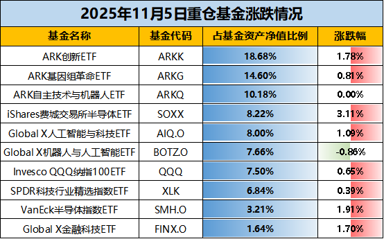 【重仓涨跌】根据基金2025年三季报披露,重仓基金中3只为“木头姐”凯茜伍德旗下聚焦于美股前沿科技的基金,合计占比达43.46%。