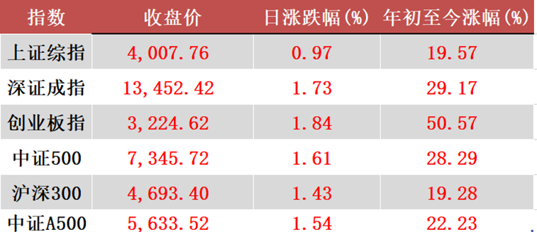 国内主要股指普涨。截至收盘,上证指数涨0.97%,收报4007.76点;深成指涨1.73%,报13452.42点;创业板指数涨1.84%,收报3224.62点。两市成交额20552亿元。行业方面,申万一级涨多跌少,有色金属领涨,涨幅为3.05%;传媒领跌,跌幅为1.35%。