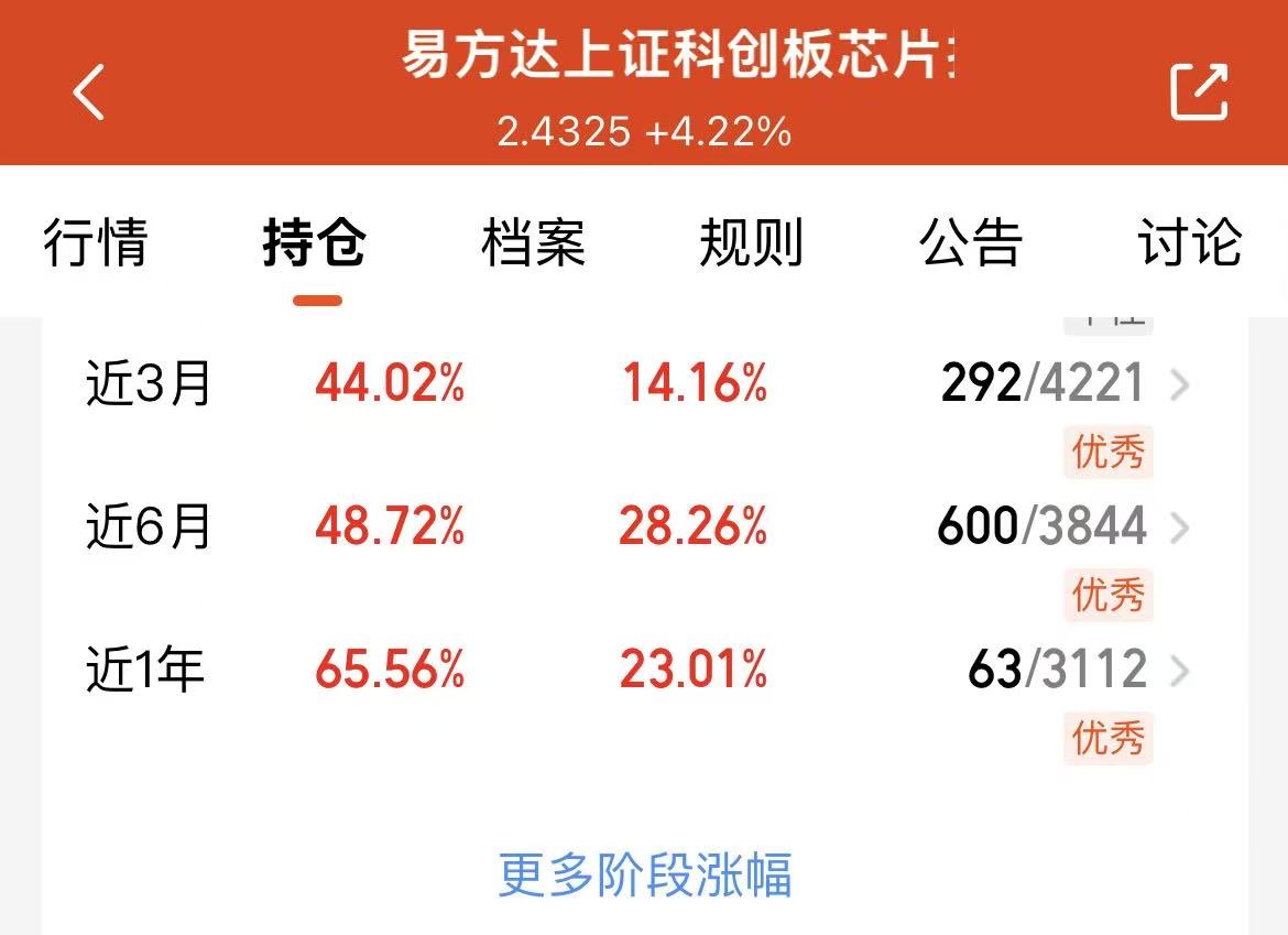 今天A股迎来反弹了,三大指数均收涨,芯片也是涨幅亮眼,比较靓仔哟。在政策上也延续集成电路企业税收优惠,而且很多项目也强制使用国产芯片、电价补贴等,芯片的需求越发的增加,未来空间是不错的。易方达上证科创板芯片指数发起C今天更新上涨4.22%,近三个涨幅48.72%,不错呀。