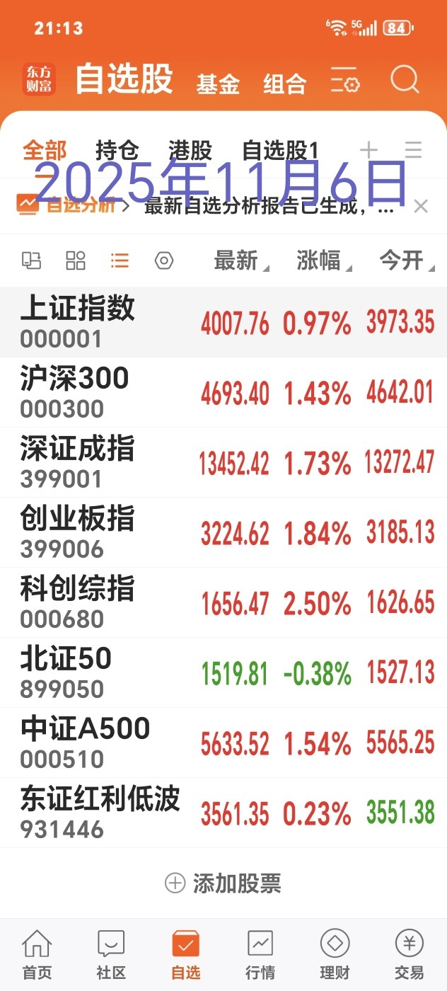 A股,今日上证综指、深证成指、创业板指、科创综指均较昨日上涨,四个市场主要综合指数全部以阳线报收,这是市场近几天向下调整途中的连续第二根阳线,今天成交量也战到了两万亿的上方,行情已有止跌企稳的迹象。