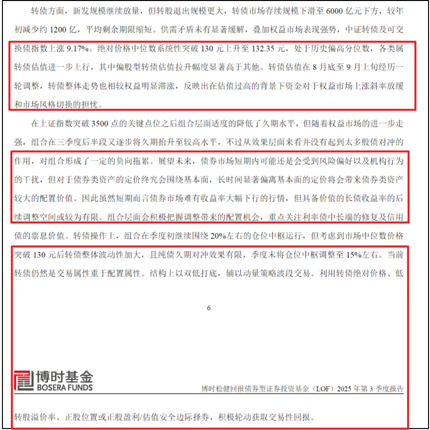 第二,基金经理认为,转债中位数突破130后,波动率依然会很大(上上下下的),而债券又起不到对冲效果,因此,三季度把转债的仓位进行了小幅下调,且认为,目前交易属性重于配置属性,整体还是偏谨慎的;