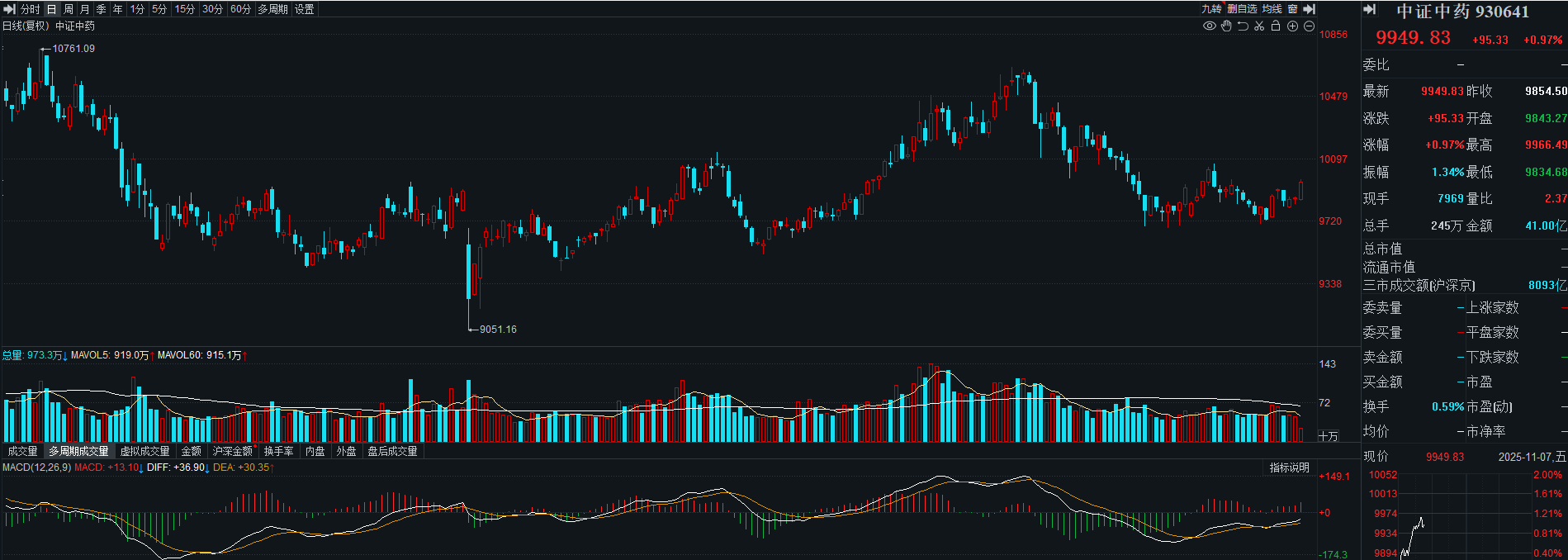 中药近期已经出现了W双低形态,但今日的拉升即将触及年线和半年线的压力位,关注尾盘的情况,如果没有强势突破的话,那么可以等一等,等回调,或者是等突破以后再去做,这样会更稳健一些。